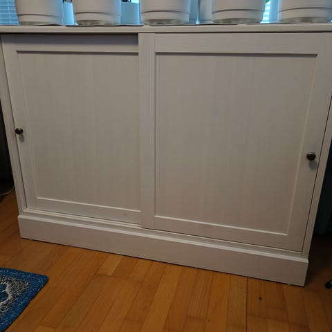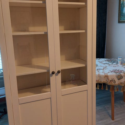 Hyväkuntoinen, valkoinen ja siisti Ikean Havsta lasivitriinikaappi liukuovilla. Koko 121x37x134 cm. Ovh. 380€.