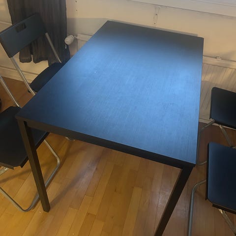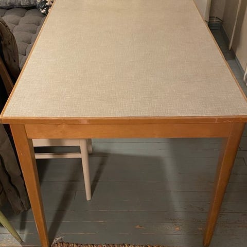 Annetaan täyspuinen kuuden hengen jatkettava ruokapöytä. Pinnassa sanomista, mutta edelleen tukeva. Mitat ilman jatkopalaa.