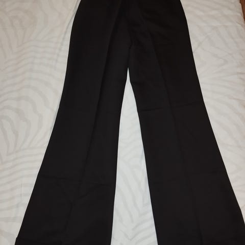 Uudet Samu-Jussi Kosken v. 2007/2008-kokoelmasta leveälahkeiset suorat housut, 6 cm leveä "upslaaki" lahkeen suussa. 60% villaa, 40% lyoncel, hyvin laskeutuva materiaali. Sivutaskut, vetoketju edessä, nappikiinnitys.