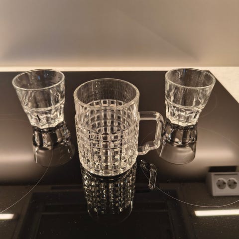 Lasit käyttämättömiä ja kunto hyvä. Toisessa lasissa pieni särö suuaukossa (kuva 3), joka ei haittaa käyttöä.