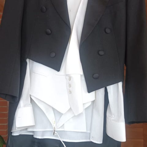 Hyväkuntoinen miesten Turon valmistama juhla/iltapukusetti: musta frakki, mustat suorat housut, valkoinen liivi ja valkoiset puuvillakäsineet. Mukaan saa kultaiset kalvosinnapit.