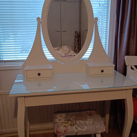 Muutaman vuoden vanha Ikean Hemnes kampauspöytä peilillä. Pöydässä on pari pientä kolhua jotka näkyvät kuvissa. Muuten pöytä on todella hyvässä kunnossa.