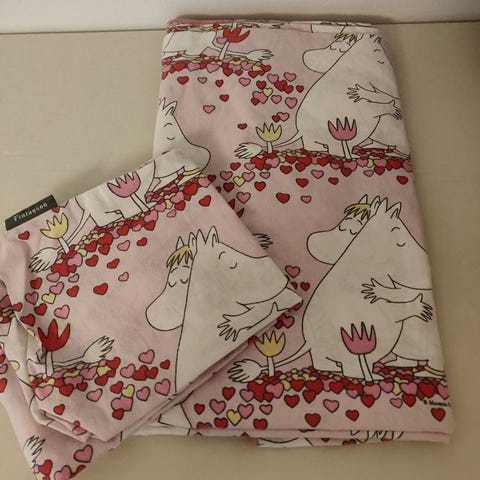 Finlaysonin "Suvi" Muumi pussilakana junior koossa, tähän ei ole tyynyliinaa. On käytetty, pesty ja kuivurissa rummutettu. Joten normaalia käytönjälkeä. Värit haalistuneet uudesta.