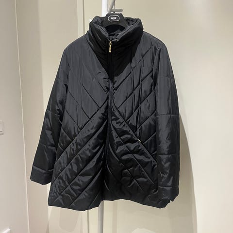 Pitkä, musta talvitakki vanuvuorilla. Päällinen polyester/polyamidi.
