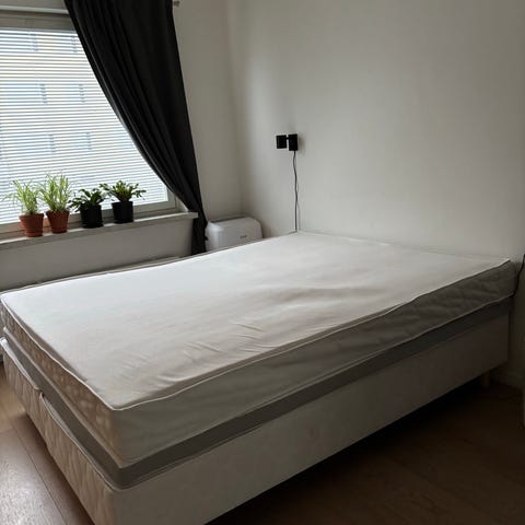 IKEA sänky harmaalla verhoilulla, valkoisella runkopatjalla ja petauspatjalla. Patjat painuneet hieman keskeltä käytössä, mutta edelleen mukava sänky.