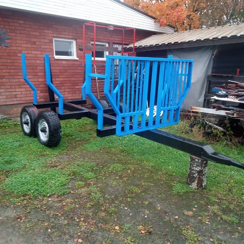 Tukkikärry puutavaran kuljetukseen, jossa on tukevat renkaat ja metallirunko. Yksiakselinen.