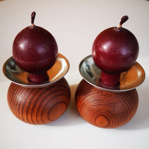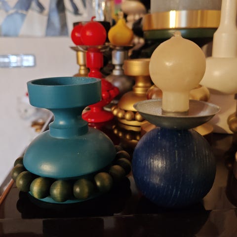 Myydään Aarikka kynttilänjalat, 2 lila/sinistä ja 1 punainen.