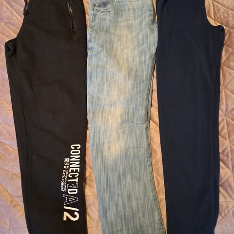 Myydään 4 farkut ja yhdet puuvillaa housut. 2farkut koko 146, ja kahdet 152. Mustat housut koko s lahkeiden suusta puuttuu narut.