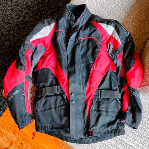 Richa Targa moottoripyörätakki mustana valkoisilla raidoilla. Takissa on vetoketjusuljenta ja sisävuori, jossa CE-hyväksyntä. Takissa on Targa- ja Richa-logoja.