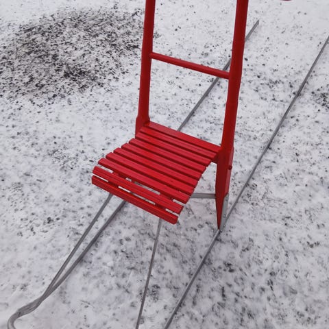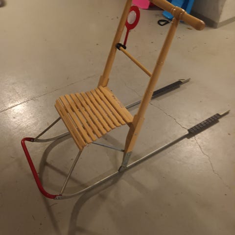 Tukeva ja hyvässä kunnossa oleva potkukelkka lyhyillä jalaksilla. Muovijalasten ansiosta kulkee ja liukuu hyvin. Maalikulumaa.