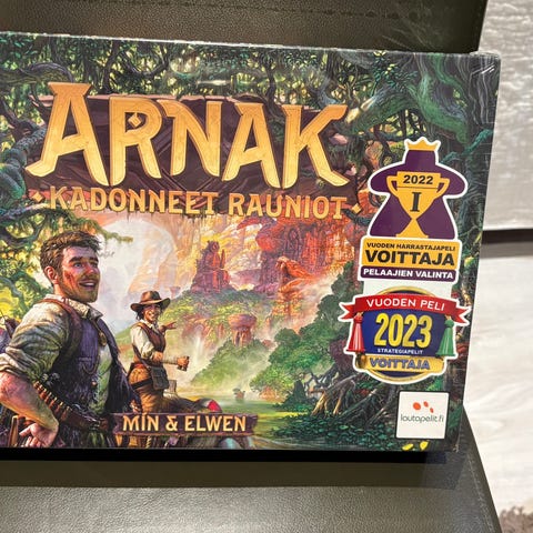 Pelaamaton Arnak strategiapeli. Vain peli osat irrotettu kehyksistä ja pussitettu.
