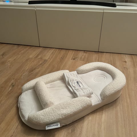 Doomoo Baby Sleep vauvan nukkumistuki/unituki, jonka avulla pieni vauva voi nukkua turvallisesti kyljellään. Otettiin pois paketista ja testattiin, mutta jäi meillä käyttämättä, koska vauva taisi olla jo liian iso ja liikkuva. Savuton ja eläimetön talous.