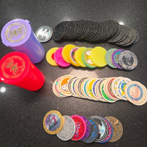 11 kpl Pog-kiekkoja ja slammereita kohtuullisessa kunnossa. 6 kpl metallisia slammereita, 2 kpl muovisia ja 3 kpl pahvisia kiekkoja.