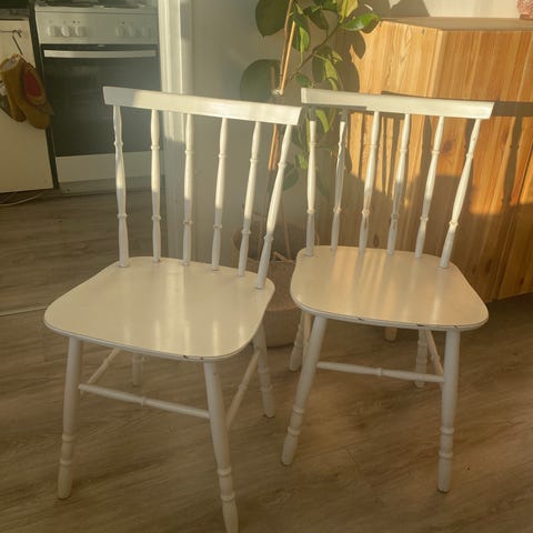 Myydään neljä pinnatuolia. Hyväkuntoiset ja ehjät. Kahdessa tuolissa vähän valkoista maalia, näkyy kuvissa. Yht. 20e