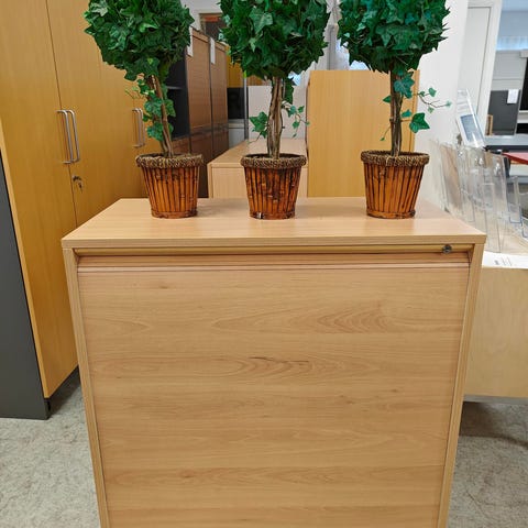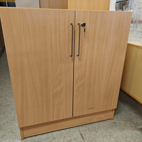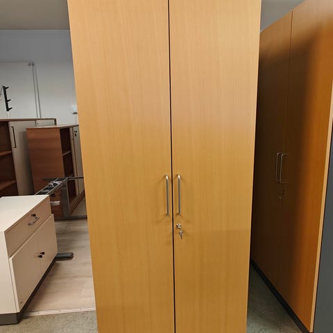 Käytetty, siistikuntoinen mappikaappi. Harmaa melamiinirunko, lukittavat ovet kirsikan väristä 3d -laminaattia. Kauniit kaarivetimet.