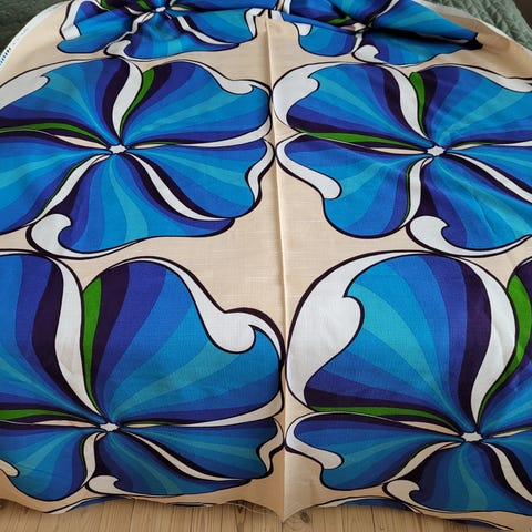 Maitokahvin väristä pimennysverhokangasta. Toinen puoli yksivärinen, toiselle puolelle painettu puu (mustalla). Kuvion korkeus 2,45 m. Kuvioita on kaksi peräkkäin, niiden väliin jää yksivärinen alue 70 cm (kuva), jolla voi säätää verhon pituuden. Kankaan leveys 1,55 cm. Kankaan toinen reuna leikattu, ei hulpiota. Vallilan kangas.