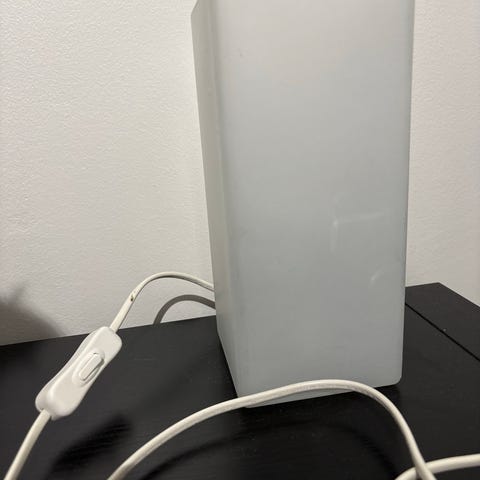 Upea pöytävalaisin huurretulla käsinvalmistetulla lasilla sekä korkkipohjalla. Valaisimessa valkoinen kangasjohto. Valaisimen korkeus: 22 cm.