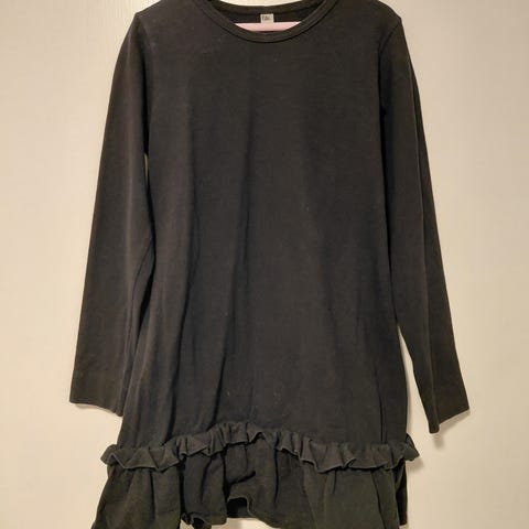 Luomupuuvillamekko. Sivutaskut. Ehjä, aavistus yleistä kulumaa. Yhden aivan hailun värjäymän (en ole yrittänyt poistaa tahranpoistolla) löysin edestä, kuvattu läheltä ja sijainti kauempaa.