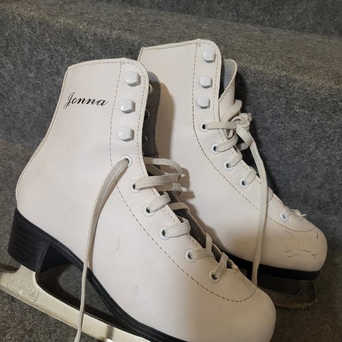 Jonna lasten kaunoluistimet, koko 32. Luistimissa näkyy käytön jälkiä, kuten naarmuja ja kulumaa.