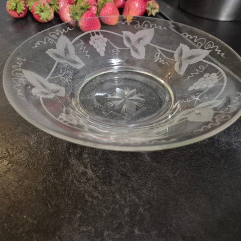 Kuvuen vanha suupuhallettu ja käsin hiottu jalallinen lasikulho.