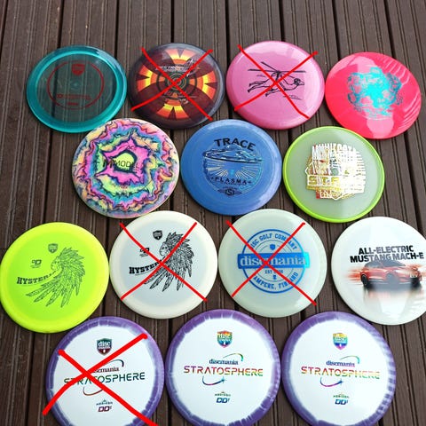 Kolmannessa kuvassa luettelo kiekoista. 2 ekan rivin kiekot ovat joko täysin uusia heittämättömiä tai korkeintaan pari testiheittoa heitettyä, parissa pienet rimmitussit, muissa normaalia pientä kosmeettista kulumaa.