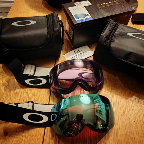 Oakley Flight Path XL laskettelulasit, joissa on sininen ja oranssi kehys ja heijastavat linssit. Laseissa on säädettävä hihna ja pehmeä vaahtomuovinen vuoraus kasvojen mukavuuden lisäämiseksi.