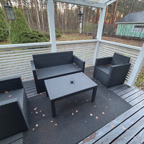 Mustat polyrottinki ulkokalusteet sohva, tuolit ja pöytä