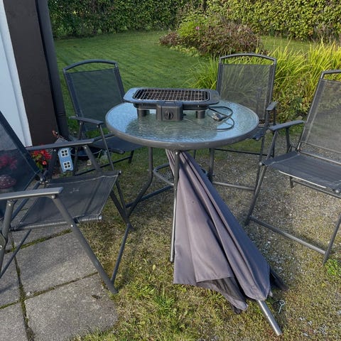 Musta rottinki pöytä 69x69cm kansi, korkeus 75cm ja tuolit. Pöydän kansi on vaaleanharmaa ja pöydän jalka musta. Koko setti hyvässä kunnossa ja vähällä käytöllä ollut.