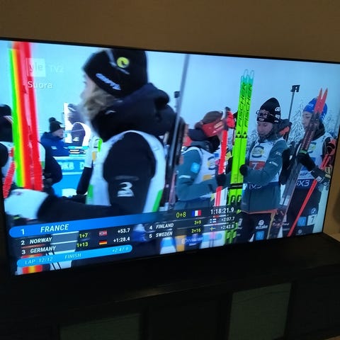 Television mitat ovat 83cmx145cm, jalat ovat irrotettavat, alkuperäisestä laatikosta löytyy alaosa joten Televisiota voi kantaa pystyssä.
