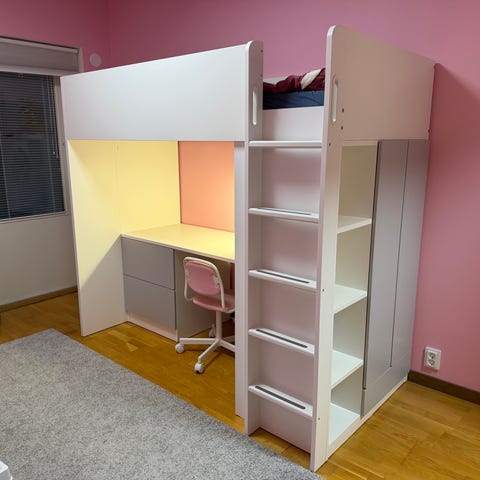 IKEA Småstad parvisänky sisältää sängyn ja integroidun työpöydän, laatikot sekä hyllyt. Pöydän ja hyllyt voi vaihtaa eri tavalla kuin kuvassa. Mukaan kaapin ovet jotka eivät ole kuvassa.