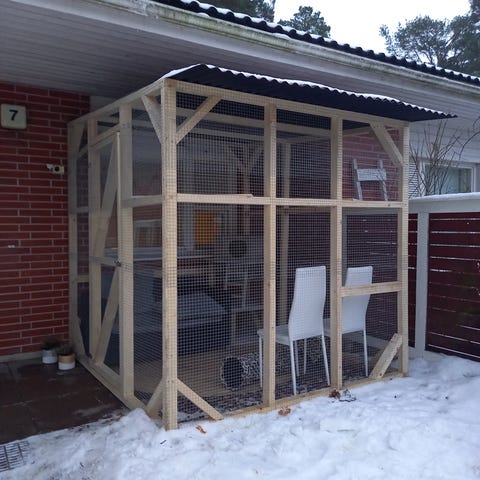 Myydään edullisesti uusi iso elementeistä tehty kissatarha ovella.