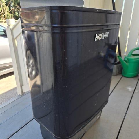 Toimiva sähkökiuas saunan purkamisen myötä uuteen kotiin.
