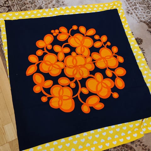 Finlayson liina, jossa oranssin, punaisen ja luonnonvalkoisen sävyinen ruutukuvio reunoilla. keskeltä yksivärinen luonnonvalkoinen. Ei ole aivan neliö. Liina on pesun jäljiltä mutta on ollut joitakin vuosia käyttämättä, joten ehkä huuhtelun tarpeessa. pienenpieni olemattoman näköinen värimuutos/tahra näyttäisi olevan keskemmällä, näkyy kuvassa joka ei ole lähtenyt pesussa.