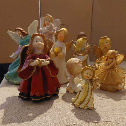 Setti sisältää 12 erilaista enkeli keräily koristefiguuria eri väreissä.