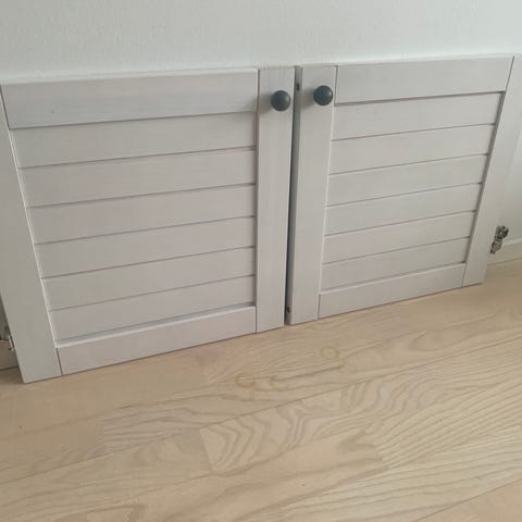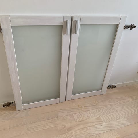 Myydään kuvienmukainen Lundian tehtaalla valkolakattu ovipari maitolasi täytteellä. Yksi ovi on mitoiltaan: korkeus 40 cm ja leveys 40 cm ja nämä sopivat Lundian 80 leveään Classic hyllyyn.
