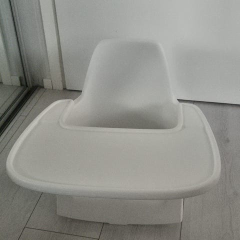 Syöttötuoli/tarjotin, valkoinen. Tukityyny ja päällinen mukana ja silikoninen syöttötuolin alusta, helppo puhdistaa ja konepesun kestävä.