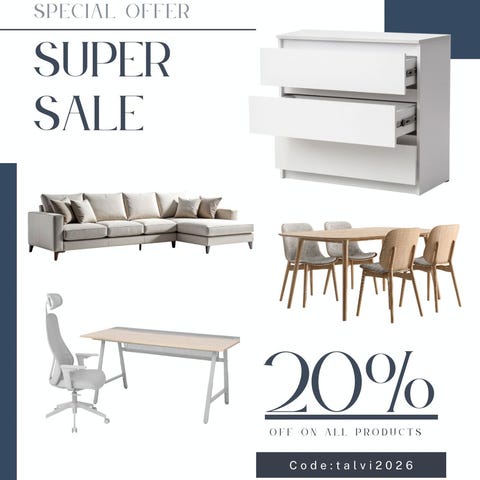 Kaikki huonekalut ovat valmiita käyttöön ja monipuolisesti eri tyylejä kotiin tai toimistoon. Saatavilla rajoitettu erä, joten toimi nopeasti!