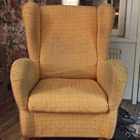 Annetaan ilmaiseksi nojatuoli, jos löytyy taitoa ja intoa korjaamiseen ja sille uuden elämän antamiseen.