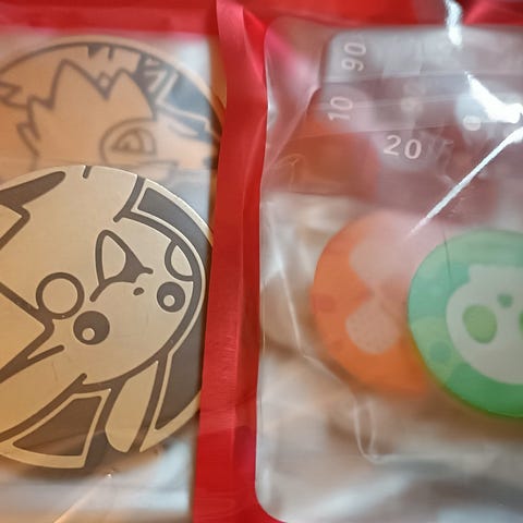 Pokémon TCG ‑markerit ja kaksi custom‑kolikkoa.