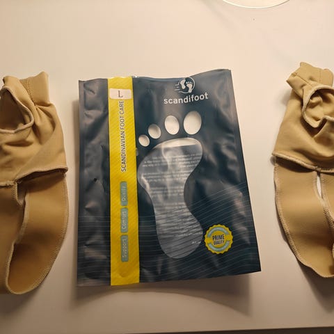 Kompressiosukat isovarpaan nivelille. Koko L (40-45). Kaksi asentoa korjaavaa pehmustettua tukea jotka auttavat vaivasenluun oireiden hoidossa. Ostettu Jalkakaupasta hintaan 19,95€. Kerran kokeiltu ja todettu liian suuriksi 40 jalkaan.