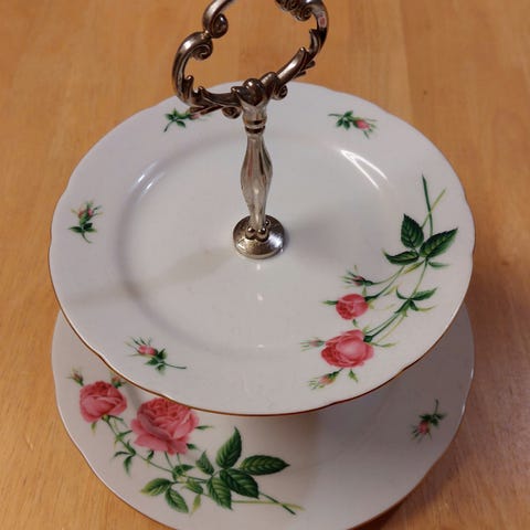Muuton alta tarpeeton koriste-esine uuteen kotiin. Sangallinen tarjoiluastia on jotain metalliseosta, halkaisijaltaan 25 cm, kaiverretty takaosaan. Kenties n. 70 v. vanha. Kukkakuvio, jalat.