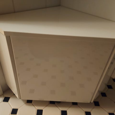 Laatikot valkeaa muovia. Laatikot siistikuntoiset, alalaatikon nupin alaosassa kulumaa/tummentumaa.
