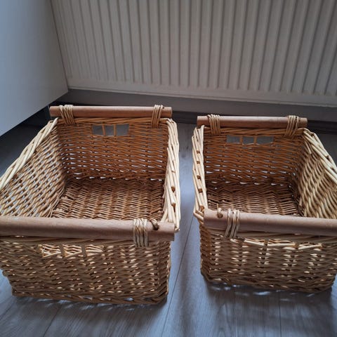 Käytettyjä mutta täysin käyttökelpoisia. Toisen korin kahvassa pientä vikaa (kuvat). Ovat varmaan ns saman kokoisia mutta jonkin verran on kokoeroa. Korkeus noin ~ 21 cm + kahvat ~ 10 cm. Halkaisija 27-31 cm. Nouto onnistuu Helsingin ruoholahdesta tai postitus. Koiratalous.