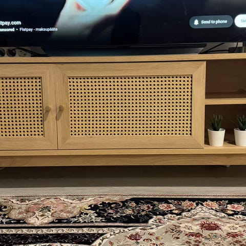 Jysk Aage Petersen TV-taso, jossa on luonnonvärinen rottinkikuvioitu etulevy ja puurunko. Huonekalu soveltuu televisiotasona tai säilytyskalusteena olohuoneeseen tai muuhun tilaan.