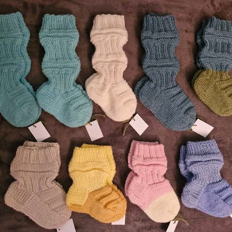 Myydään uudet, käsinneulotut JUSSI sukat ja myssy vauvalle.
