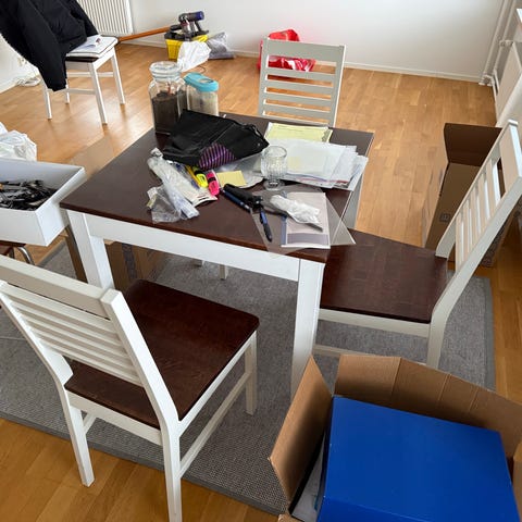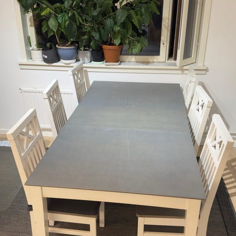 Muutoin vielä käyttökelpoinen, laadukas ja kivannäköinen ruokailuryhmä (jos yhden tuolin vain korjaa). Pikkuviat lähinnä esteettisiä, jotka saa pöytäliinalla piiloon.
