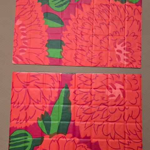 Marimekko Appelsiini pöytätabletti 2 kpl, kuosin design Maija Isola. Materiaali muovi. Käytetty ok kunto, jonkun verran haaleita jälkiä ja toisella puolella haalistumaa väreissä. Yhteishinta.