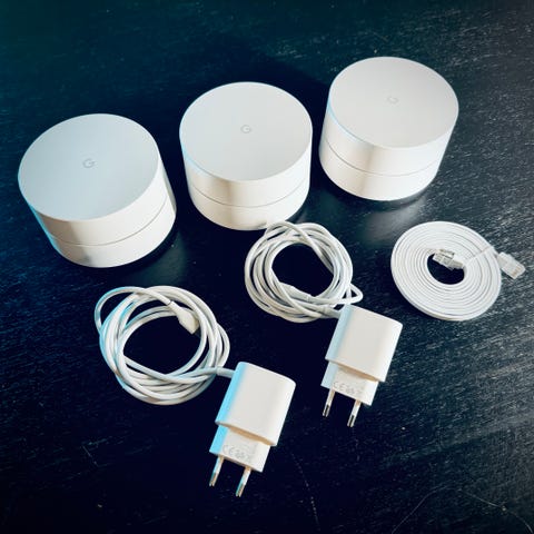 Google Nest Wifi reititinvalikoima, väri valkoinen. Malli AC1304. Mukana virtalähteet. Soveltuu kotiverkon langattomaan laajentamiseen.