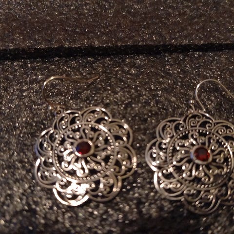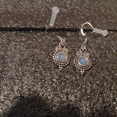Hopeanväriset korvakorut värikkäillä "kivillä". Eivät ole hopeaa. Voin postittaa.