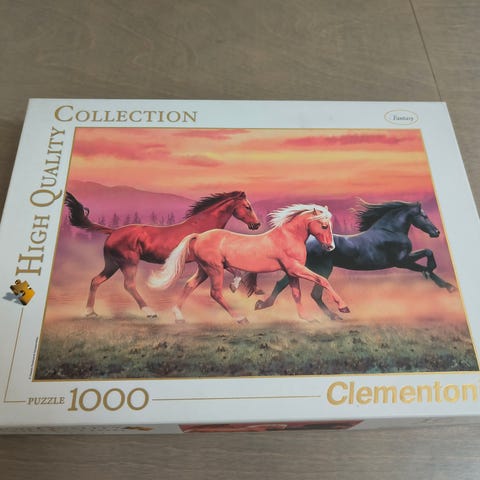 Myynnissä Clementonin hevosaiheinen palapeli, jossa on 1000 palaa. Ostettu käytettynä ja muuten erinomaisessa kunnossa paitsi, että parissa palassa on pientä tummentumaa (ks.kuva). Tämä ei kuitenkaan häiritse kokoamista ja tummentuma ei ole suurta. Luonnollisesti kaikki palat tallessa.